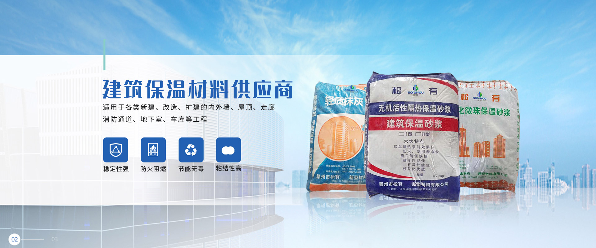 江西松有新型材料有限公司,主要從事保溫材料、防水材料銷售,兼營建筑材料、裝飾材料和金屬材料等銷售,主要產(chǎn)品有巖晶砂、高分子益膠泥、輕質(zhì)抹灰砂漿石膏、防滲抗裂砂漿、玻化微珠保溫砂漿、砌塊砌筑粘接劑、無機(jī)活性隔熱保溫砂漿、加氣磚專用砌筑砂漿等。